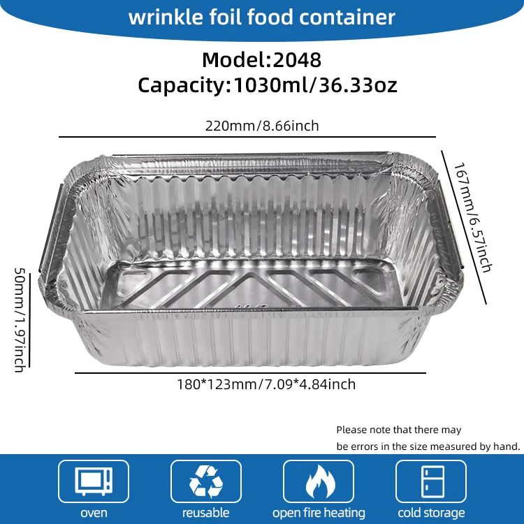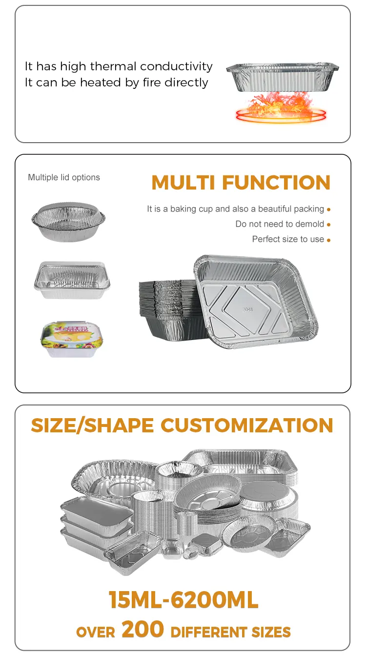 Yunchu Aluminum Foil Factoryn kertakäyttöinen grilli-leivonnainen lounaslaatikko hopea alumiinifoliosäiliö on valmistettu erittäin puhtaasta elintarvikelaatuisesta alumiinifoliosta. Se on myrkytön ja mauton, kestää korkeita ja matalia lämpötiloja. Sulamispiste on jopa 250 °C. Se voi olla suorassa kosketuksessa ruoan kanssa. Se ei vapauta haitallisia aineita kuumennettaessa korkeissa lämpötiloissa. Se voi myös säilyttää vakaan muodon jääkaapissa ja pakastettuna. Se on kertakäyttöinen ja voidaan heittää pois käytön jälkeen. Ei tarvitse tuhlata aikaa lautasten ja paistinpannujen puhdistamiseen, täysin myrkytöntä. Se ratkaisee ikävän siivousongelman aterioiden jälkeen ja sopii erityisen hyvin kohtauksiin, kuten monien ihmisten kokoontumiseen ja ulkoiluun. Päivitetyllä paksunnetulla alumiinifoliomateriaalilla on kiinteä rakenne ja vahva tukikyky. Se ei ole helppo vuotaa tai vääntyä, kun pidät astioita, joissa on keittoja tai raskaita grillausaineita. Reunat ovat sileät ja jäysteettömiä, mikä tekee käytöstä turvallisempaa. Se soveltuu myös uuneihin, ilmakeittimiin, höyrylaitteisiin ja muihin keittiövälineisiin, ja ruoanlaitto ja tarjoilu onnistuu yhdessä vaiheessa.