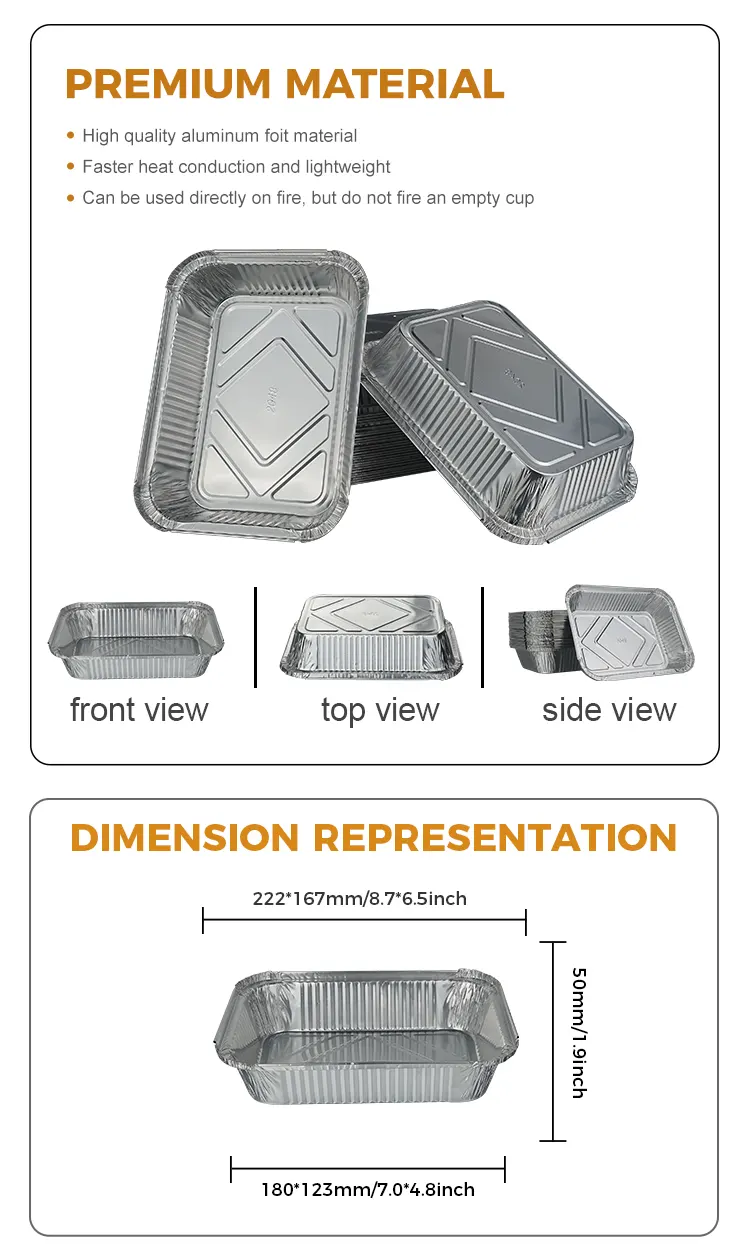 Yunchu Aluminum Foil Factoryn kertakäyttöinen grillauslounasrasia hopeaalumiinifoliosäiliö sopii useimpiin kohtauksiin, olipa kyseessä grilliravintola, länsimainen ravintola, kotiruokaravintola tai leipomo, tämä hopea alumiinifoliolounaslaatikko voi parantaa tehokkuutta. Grilliravintolat voivat käyttää sitä suoraan grillattujen vartaiden, grillattujen vihannesten ja grillattujen merenelävien tarjoiluun. Hopeinen ulkonäkö yhdistyy tuoksuvien ainesosien kanssa. Sillä on täysi visuaalinen vaikutus ja se on katseenvangitsija tarjoiltuna. No-clean muotoilu vähentää astianpesun työmäärää keittiössä ja säästää työvoimakustannuksia. Se sopii erityisen hyvin nopeisiin aterioihin ruuhka-aikoina. Leipomot käyttävät sitä leivottujen kakkujen, munatorttujen ja keksien tarjoiluun. Ne voidaan paistaa suoraan uunissa, eikä niitä tarvitse paistaa paistamisen jälkeen. Lautasten vaihtaminen ja laittaminen suoraan myyntiin on kätevää, samalla kun jälkiruokien lämpötila ja muoto säilyvät. kotiruokaravintoloita voidaan käyttää noutoruokaan, ja vuotamaton muotoilu estää tehokkaasti keiton läikkymisen. Alumiinifolion lämpösäilytys voi pidentää ruoan vakiolämpötila-aikaa. Tämä kertakäyttöinen alumiinifoliolounasrasia ratkaisee täydellisesti retkeilyyn, piknikille, ulkogrilliin ja suurien astioiden kantamiseen ja ruokailun jälkeen siivoamiseen liittyviin ongelmiin. Materiaali on ohutta ja kevyttä, ja se on helppo säilyttää. Se voidaan taittaa ja pinota halutessasi, jolloin se ei vie tilaa repussasi ja tekee sen kantamisesta vaivatonta.