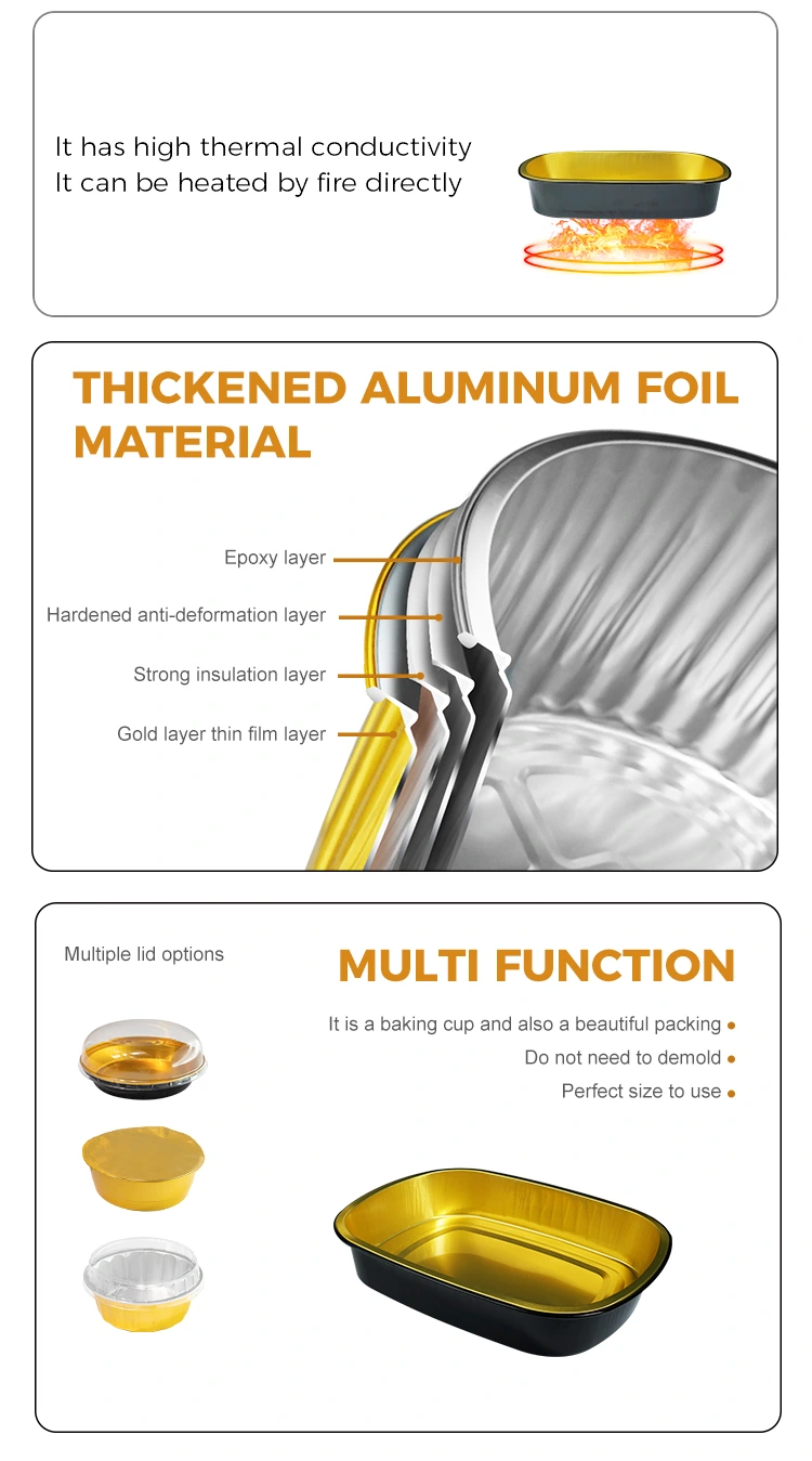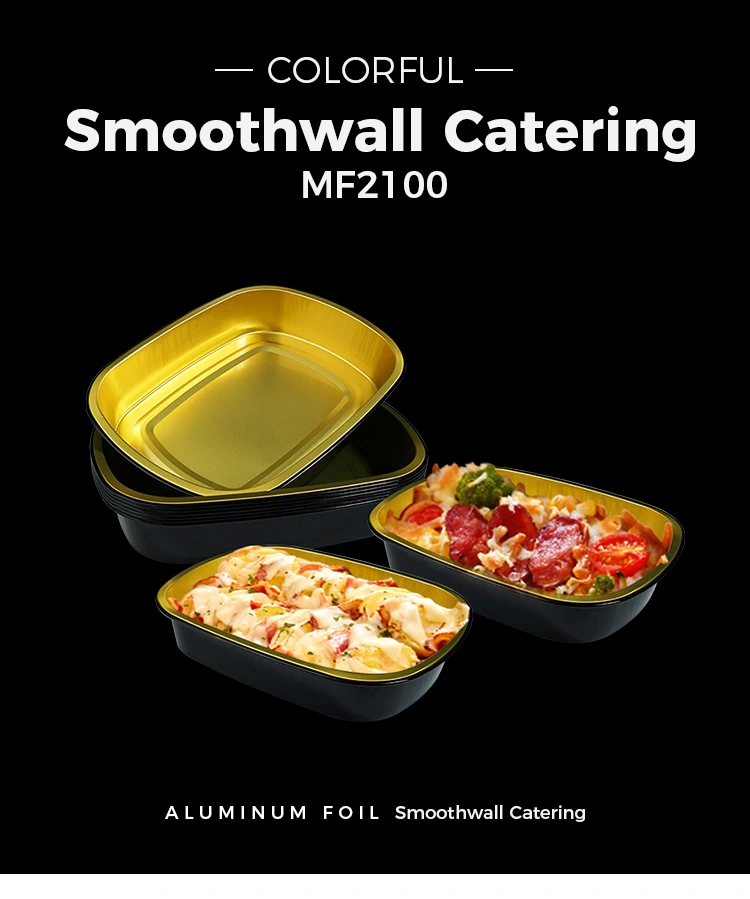 Yunchu-alumiinifoliotoimittajan kertakäyttöiset mustan kultaiset ateriapalveluiden suorakaiteen muotoiset alumiinifolioastiat soveltuvat suurten volyymien ateriapalvelu- ja takea-teollisuuteen, erityisesti paistamiseen, ruokailuketjuihin ja itsepalveluketjuihin ja muihin skenaarioihin. Ainesosia sijoitettavaksi voidaan käyttää alumiinifolion tiivistyskansilla ja PET: llä täysin läpinäkyvällä kansilla, erinomaisella tiivistymisteholla, korkean lämpötilan vastus- ja öljy- ja vuotojen ehkäisytoiminnolla. Sitä käytetään laajasti erilaisissa skenaarioissa, kuten elintarvikepakkauksissa, lämmityksessä, jäähdytyksessä ja takean toimittamisessa. Pinta käyttää kevyen seinän suunnittelun, tasaisella ja sileällä ulkonäöllä, mikä on kätevä lämpöä suljetun kalvon automaattiseen tiivistämiseen, mikä parantaa pakkaustehokkuutta.