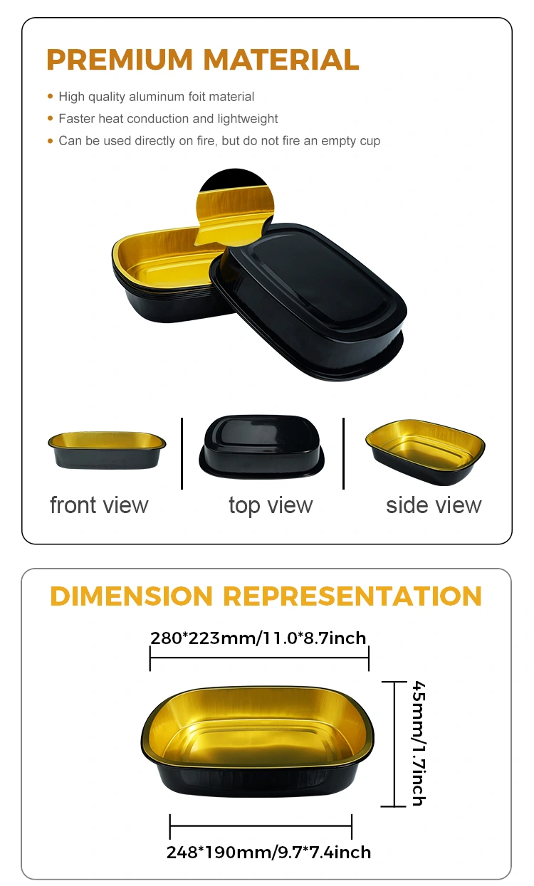 • Kertakäyttöiset mustan kultaiset ateriapalvelut Suorakulmaiset alumiinifolioastiatKertakäyttöiset mustan kultaiset ateriapalvelut Suorakulmaiset alumiinifolioastiat