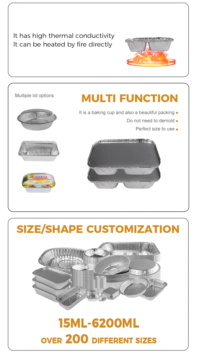Yunchu -alumiinifoliosyöttötehtaan kertakäyttöisen osaston pikaruoan hopea -alumiinifoliosäiliömalli on 75600, ylemmän halkaisijan 206 mm (8,1 tuumaa), 150 mm (5,9 tuumaa), halkaisija 170 mm (6,6 tuumaa), 106 mm (4,1 tuumaa) ja korkeus 50 mm (1,9 tuumaa). Kapasiteetti on noin 860 ml (30,3 unssia). Tällä alumiinifoliolounaslaatikoilla ei ole vain erinomaista lämmönpidätyskykyä, vaan se voidaan myös yhdistää alumiinifoliokannen kanssa. Lisäksi tarjoamme räätälöityjä logopalveluita syventämään asiakasmuistia ja parantamaan tuotemerkkitietoisuutta.