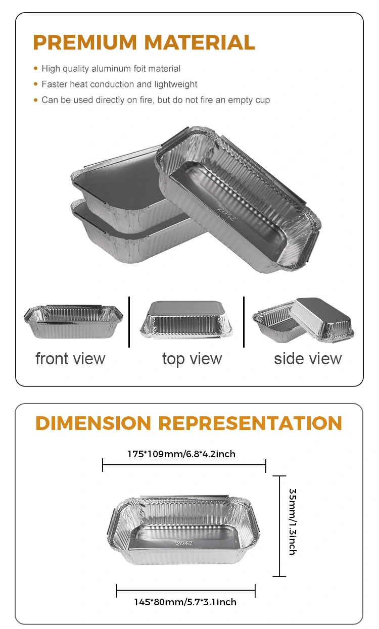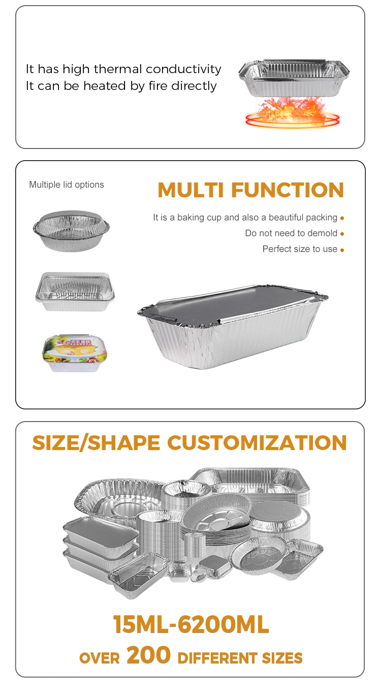 Tämä kertakäyttöinen pikaruoka-laatikko grilli hopea-alumiinifolioastia on valmistettu korkealaatuisesta 8011-alumiinifoliomateriaalista, jolla on hyvä lämmön säilyttämisvaikutus ja joka voi ylläpitää ruoan lämpötilan, mikä tekee ruoasta herkullisemman ja herkullisemman. Lisäksi suorakaiteen muotoinen BBQ -hopea -alumiinifolioastiamme on myös varustettu lämpöeristystoiminnolla, joka voidaan yhdistää alumiinifoliokannen tai PET -muovikannen kanssa, joka on kätevä räätälöityyn logoon ja parantaa edelleen tuotemerkkikuvaa.