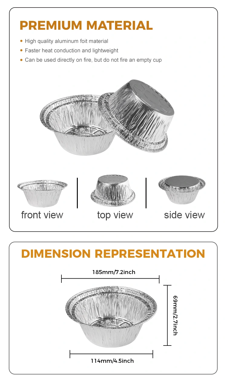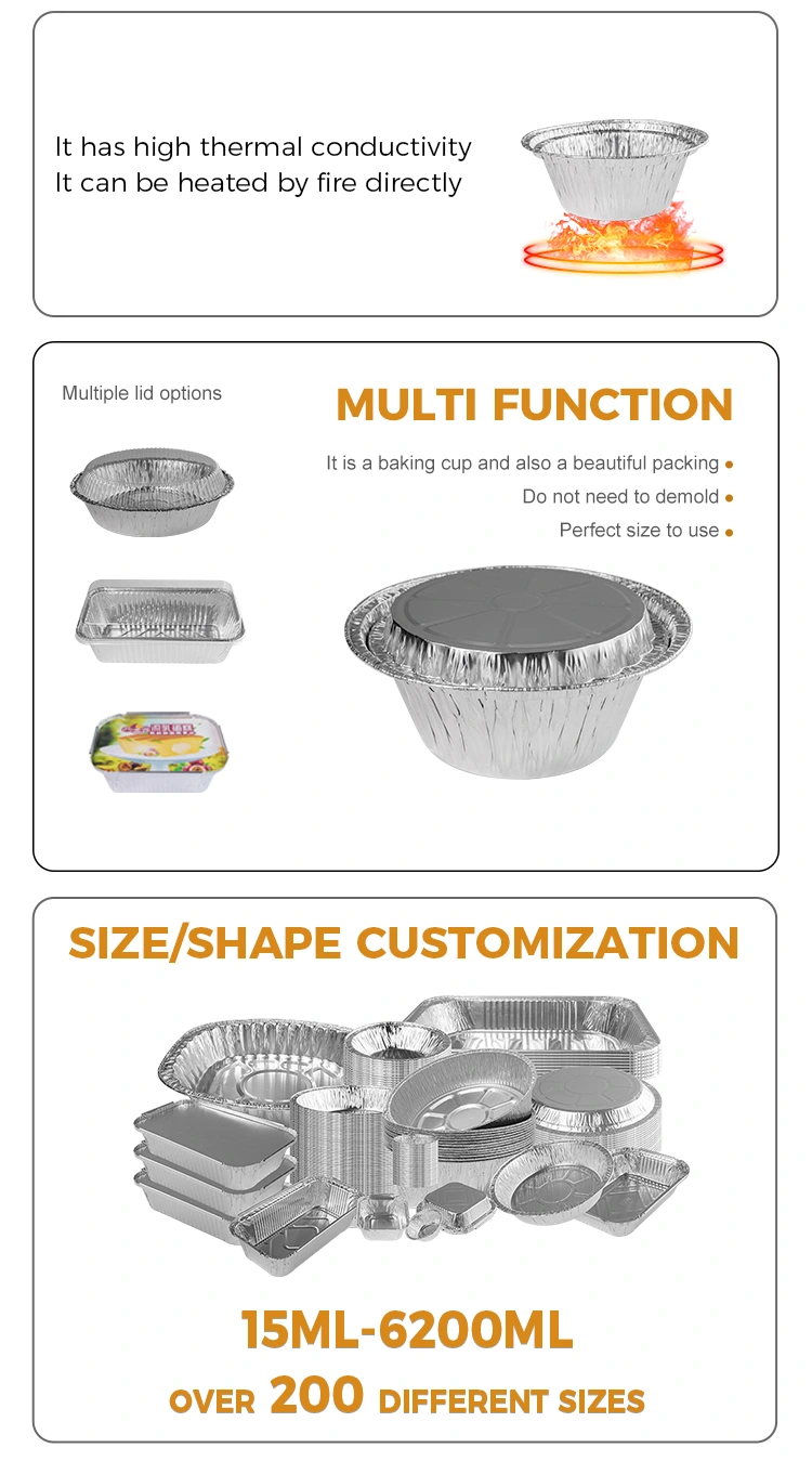 Yunchu -alumiinifolio -kertakäyttöisen Gratin Takewayn hopeafolioastialla on ainutlaatuinen muotoilu, kevyt ja helppokäyttöinen, painaa vain 9,9 grammaa, mikä tekee pinoamisesta ja säilyttämisestä helpon, säästäen tilaa ja sijoittamisaikaa. Tuote valmistetaan käyttämällä edistynyttä valon seinäprosessia sileällä ja tasaisella pinnalla, joten se on ihanteellinen merkinnöihin ja skannaamiseen suurten supermarketien elintarvikkeiden käsittelyn jälkeen. Sen tilava kapasiteetti riittää pitämään erilaisia ​​päivittäisiä ruokia ja välipaloja, jotka tyydyttävät monipuolisia käyttötarpeita. Kertakäyttöisenä tuotteena sitä ei tarvitse puhdistaa, mikä vähentää merkittävästi työvoimakustannuksia. Lisäksi tuote on varustettu alumiinifolio -PET -kansi- ja alumiinifolio -lämmön tiivistyskalvolla, jolla on erinomainen öljyvuoto ja vedenpitävä suorituskyky, ja se voi ylläpitää vakautta ja muodonmuutoksia korkeissa lämpötiloissa, mikä parantaa ruoan tuoreutta ja lämmön säilyttämisvaikutusta, etenkin kun se on suljettu ja kuljetettu.