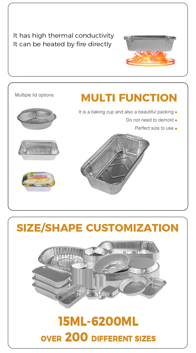 Yunchu -alumiinifoliotoimittajan kertakäyttöiset suorakaiteen muotoiset leivonnaiset hopea -alumiinifolioastiat ovat monipuolinen keittiötyökalu, joka sopii erilaisiin keittomenetelmiin, kuten grillaamiseen, kuumaan pottiin, gratiniin, takeaway -pakkauksiin ja muihin. Tämä säiliö on riittävän kompakti sopimaan erilaisiin ruukkuihin ja laitteisiin, ja se on erikokoisia erilaisten avoimien liekki -grillausten tarpeiden tyydyttämiseksi. Sitä voidaan käyttää erilaisten elintarvikkeiden, kuten ilmavaikuttajien ja muiden laitteiden sovellusten, lämmön ja öljynkestävyyden, helpon leipomisen valmistukseen.