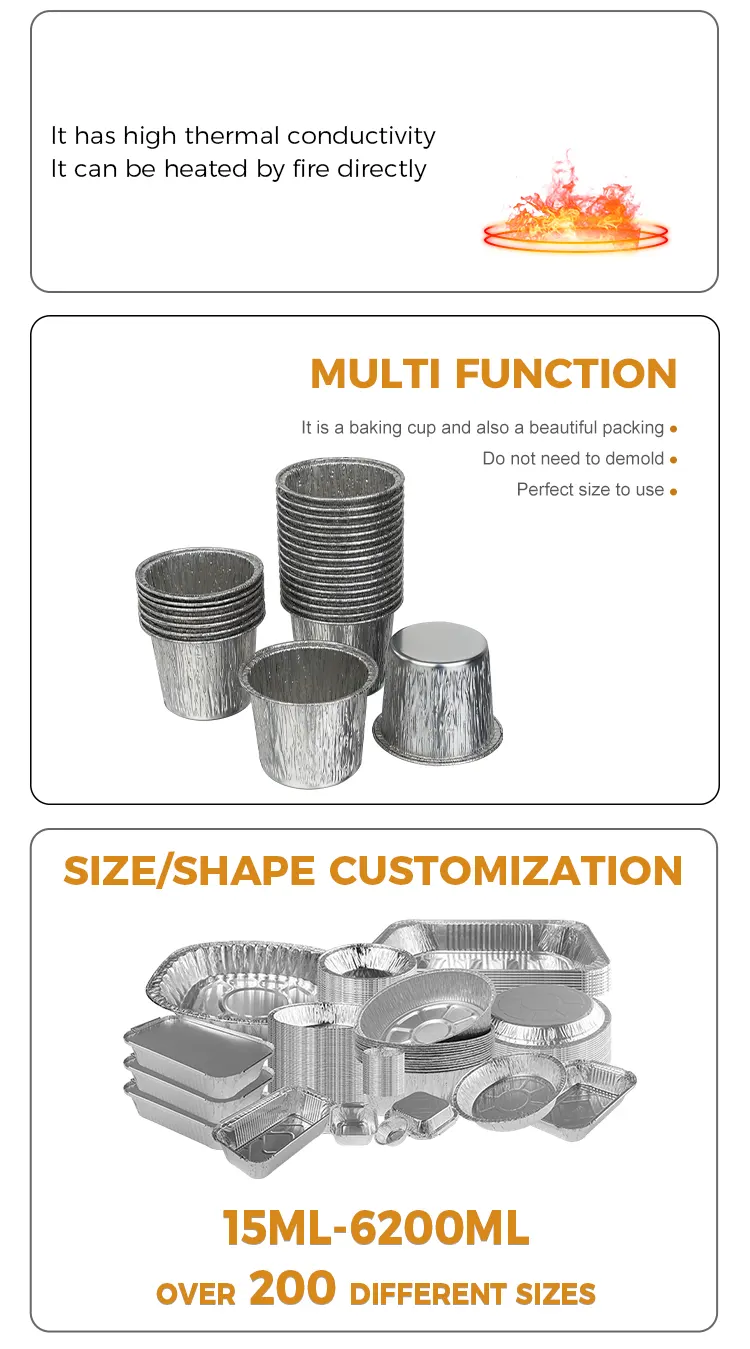 • Kertakäyttöiset pyöreät kakkukupit hopeaalumiinifolioruokapakkauksetKertakäyttöiset pyöreät kakkukupit hopeaalumiinifolioruokapakkaukset