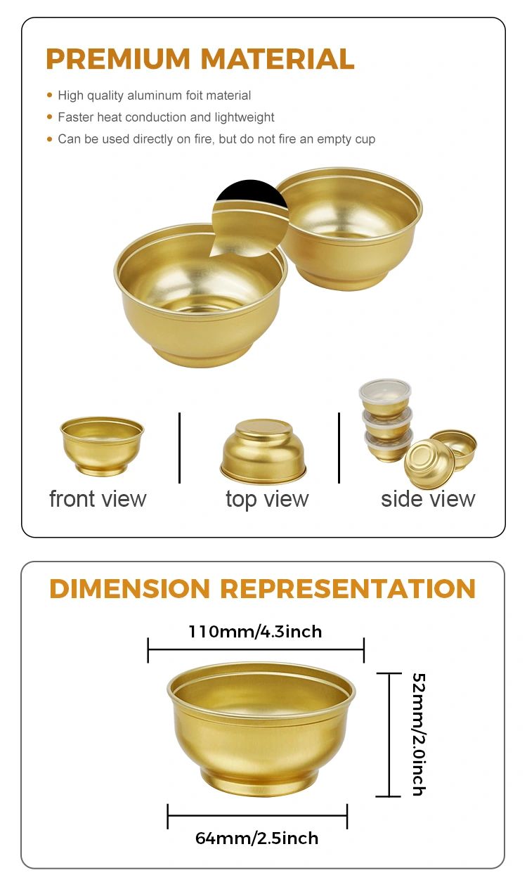 Yunchu-alumiinifoliovalmistustehdas, kertakäyttöinen pyöreä pieni kultakulho-alumiinifolioastia, ainutlaatuisesti muotoiltu kulhotyyppinen alumiinifolioastia, tämä astia on suunnattu pakkauksiin, esikypsytettyihin aterioihin, riisi, nuudelit jne. Se on helpompaa kuin takeout, taloudellisempi kuin ruokailutila ja maukkaampi kuin aterian vaihtaminen vapaita. Yksilöllisesti pakatut kulhot eivät ole alttiita ihovaurioille, helppo kantaa, valmistettu valituista tukevista ja kestävistä materiaaleista, yksilöllisesti kääritty, tyhjiö steriloitu, helppo avata ja syödä, kykenevä lukitsemaan tuoreuden kypsennyksen aikana 121 ° C: ssa. Alkuperäistä kulhoa ei voida lämmittää mikroaaltouunissa. Saatavana erilaisina eritelminä, pinottavissa varastointia varten, alumiinikulhot voidaan pinota keittiön pitämiseksi siistinä ja järjestettyinä. Eri koot vastaavat erilaisia ​​pakkaustarpeita - yksi kulho kerrallaan on aivan oikein.