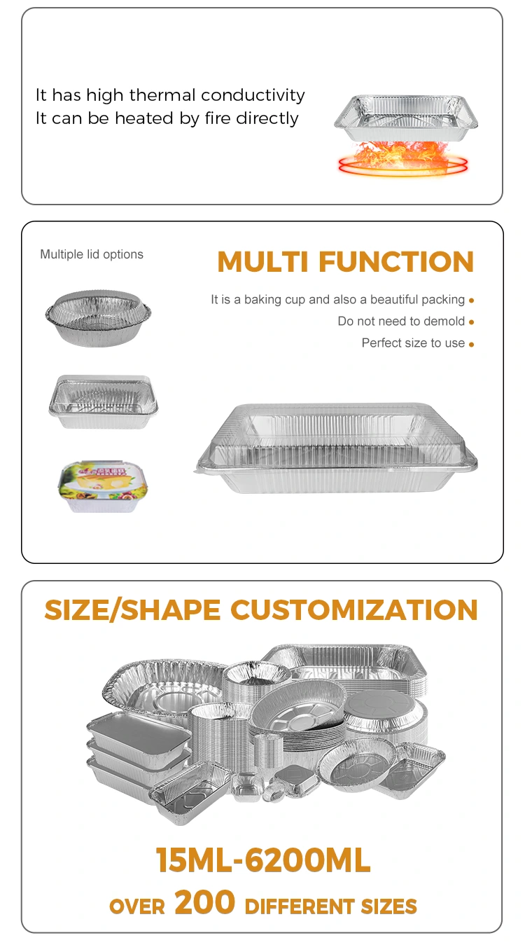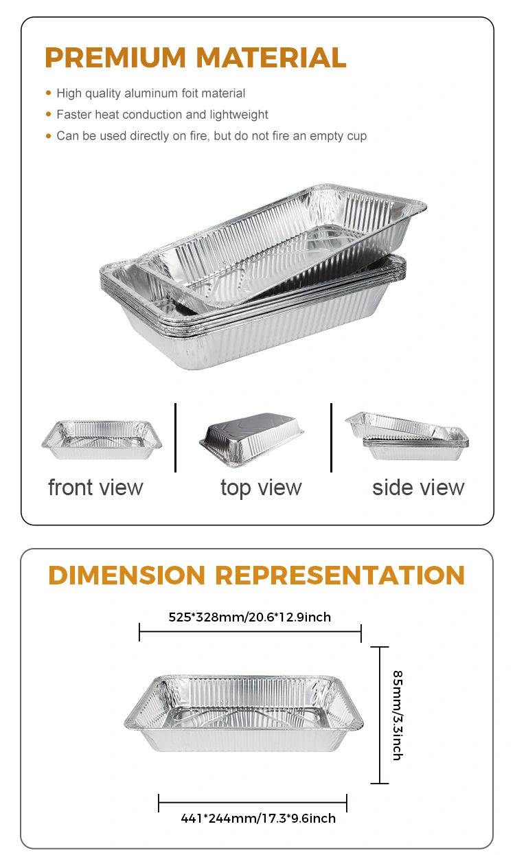 Ominaisuudet: Tämä suuri kapasiteetti ulkona leivinpannu hopeafolioastia on valmistettu elintarvikelaatuisesta 8011-0-alumiinifoliomateriaalista, joka täyttää täysin elintarvikelaatuisen kosketusstandardin, varmistaa elintarviketurvallisuus ilman erityistä hajua ja varmistettua käytettäväksi. Siinä on kovera ja kupera sisäinen muotoilu, jota on turvallisempi käyttää. Laitteissa ei ole puhdistusta ja suojaa laitteiden vuorausta hyvin. Olipa paistaminen tai lämmitys avoimen liekin päällä, astioiden muodonmuutoksista ei tarvitse huolehtia tai vaikuttaa elintarviketurvallisuuteen.