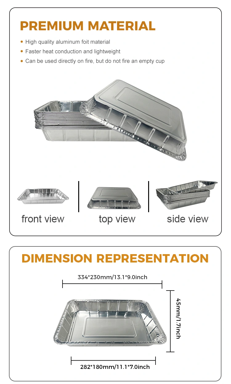 Yunchu -alumiinifoliotoimittaja Suuret grillatut kala -takeaway hopea -alumiinifolioastiat vastaavat erilaisia ​​ruoanlaittotarpeita, jotka sopivat eri tapauksiin, kuten ilmavaikuttajat, grilligrillit, rotisserie -uunit ja merenelävien valmistus. Tämä alumiinifoliosäiliö on suunniteltu erityisesti korotetulla reunalla, jotta ruokaa estäisi tehokkaasti vuotamisen ja tarttumisen potin seinämään, ja se suojaa pannuvuorausta useilla kerroksilla, mikä on käytännöllistä ja huolettomia. Se on valmistettu elintarvikelaatuisesta 8011-0 -materiaalista, lämpötilan lämpötilassa jopa 520 ° C, ei poltettu tai rikki, ja paksuuntunut materiaali ei ole helppoa muodonmuutosta. Alumiinifoliolaatikko on paksuuntunut kokonaisuutena, joten voit hakea sen helposti kypsennyksen jälkeen huolehtimatta muodonmuutoksesta käytön aikana. Hemmed -malli tekee siitä mukavan pitää ja reunat ovat pyöristettyjä, joten sinun ei tarvitse huolehtia sormien naarmuuntumisesta. PET: n täydentävät sileät reunat täysin läpinäkyvät kannet ja alumiinifoliofoliokannen kannet, mikä sopii paremmin moniin keittomenetelmiin.