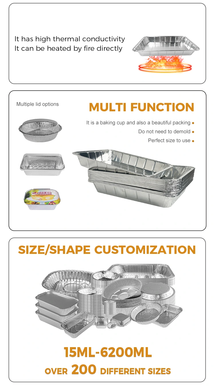 Yunchu -alumiinifoliotukemalli YF2400 Suuret grillatut kalat takeway hopea -alumiinifolioastiat sopivat kaikenlaisille suurille leipomovarusteille, kuten leipomouuneille, retort -laatikoille ja grilligrilleille jne. Tämä tuote on suunniteltu kertakäyttöiseen grilli -taukottamiseen. Levy eikä ole helppo polttaa, mutta se voi myös suoraan ottaa yhteyttä avoimeen liekkiin. Tuote on läpäissyt asiaankuuluvat kansalliset sertifikaatit turvallisen käytön varmistamiseksi. Lisäksi sillä on erinomainen lämmönkestävyys ja se voi pysyä vakaana korkeissa lämpötiloissa, ei helppo muodostaa tai halkeilla. Tee tiukat sisäiset testaukset tuotteen turvallisuuden ja luotettavuuden varmistamiseksi.