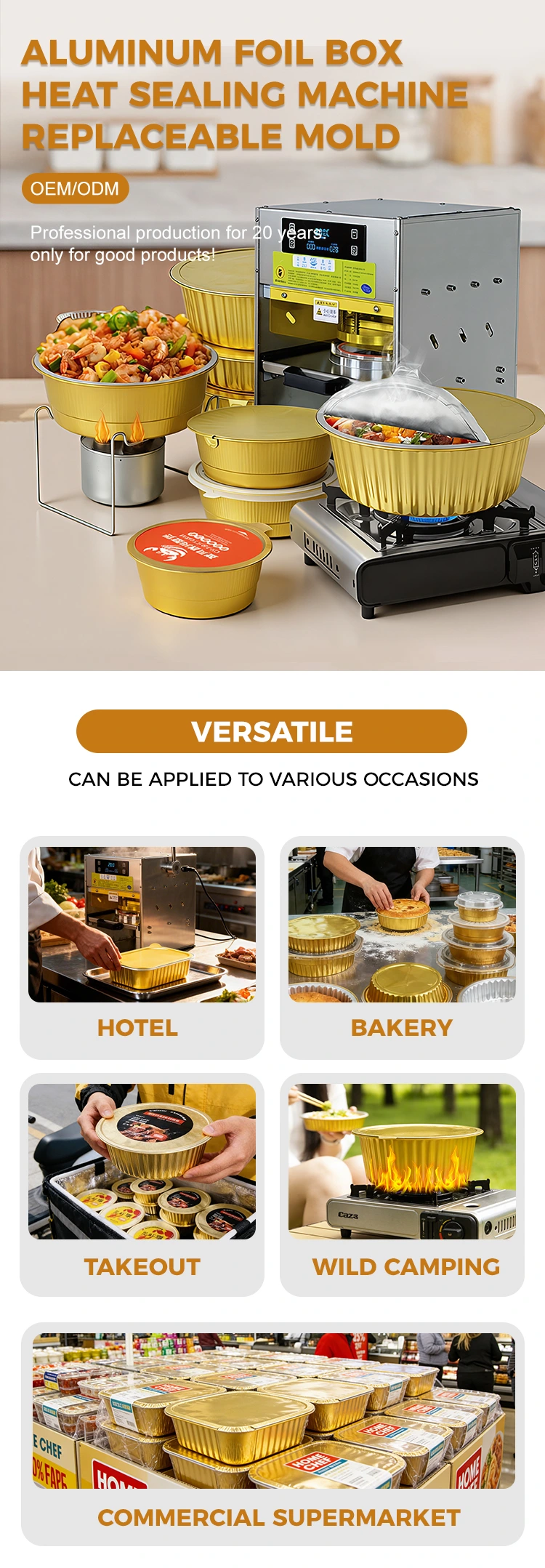 Yunchulla on oma tehdas, ja se valmistaa ja toimittaa manuaalisia kuumasaumauskoneita kultaisilla alumiinifoliosäiliöillä Kiinassa. Se käyttää elintarvikelaatuisia materiaaleja ja on turvallinen ja huoleton. Valmistettu elintarvikekelpoisesta alumiinifoliosta/PP-materiaalista, se on läpäissyt arvovaltaiset turvallisuustestit, on hajuton, kestää korkeita ja alhaisia ​​lämpötiloja (-20℃ - 220℃) ja voidaan lämmittää suoraan mikroaaltouunissa, paistaa uunissa tai pakastaa varastointia varten, mikä täyttää elintarvikkeiden monipuoliset käsittely- ja säilytystarpeet ja antaa kuluttajille vahvan turvallisuuden tunteen.