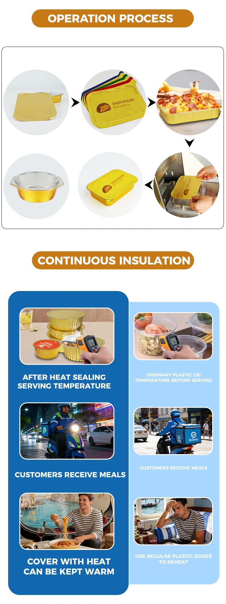 Vahva mukautumiskyky ja yksinkertainen käyttö: Täysin yhteensopiva tämän kultaisen lounaslaatikon kanssa ja yhteensopiva myös erilaisten PP/PE-komposiittikalvopakkausten kanssa. Ammattikoulutusta ei tarvita, ja pääset alkuun vain 10 sekunnissa. Sulje vain ja kohdista lounaslaatikko ja paina lämpösaumausainetta varovasti 3–5 sekuntia sulkeaksesi loppuun, mikä parantaa merkittävästi pakkaustehoa.