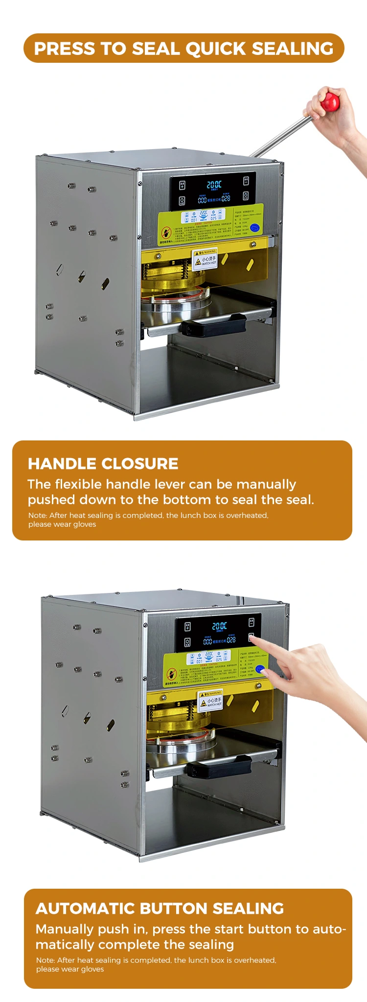 Tehokkaampi: Ei tarvitse yhdistää erillisiin tiivistekalvoihin. Lounaslaatikot ja lämpösaumaajat ovat heti käyttövalmiita. Manuaalinen käyttö ei vaadi esilämmityksen odottamista. Pienet erätilaukset voidaan käsitellä nopeasti, ja suuria tilauksia voidaan myös edetä tasaisesti. Se pystyy helposti käsittelemään skenaarioita, kuten ruuhkat ruokailuajat ja äkilliset festivaalitilausten nousut.