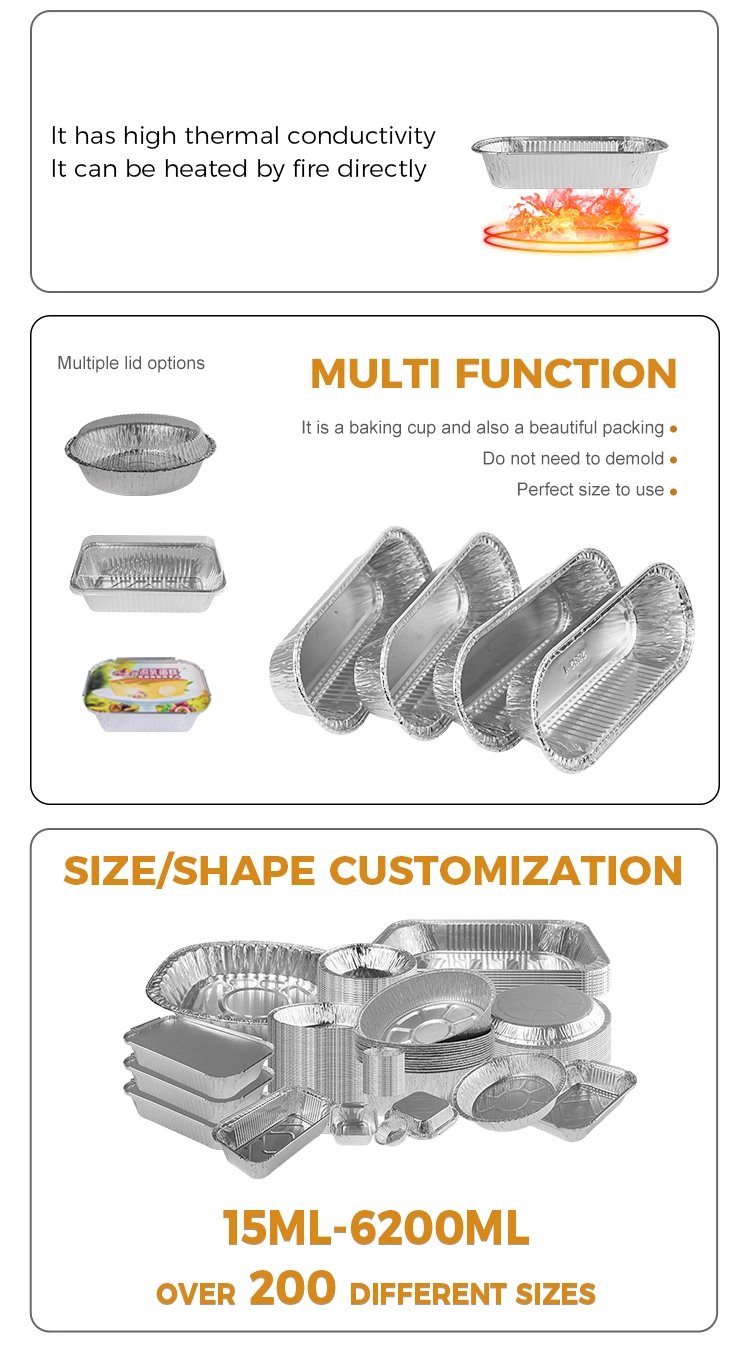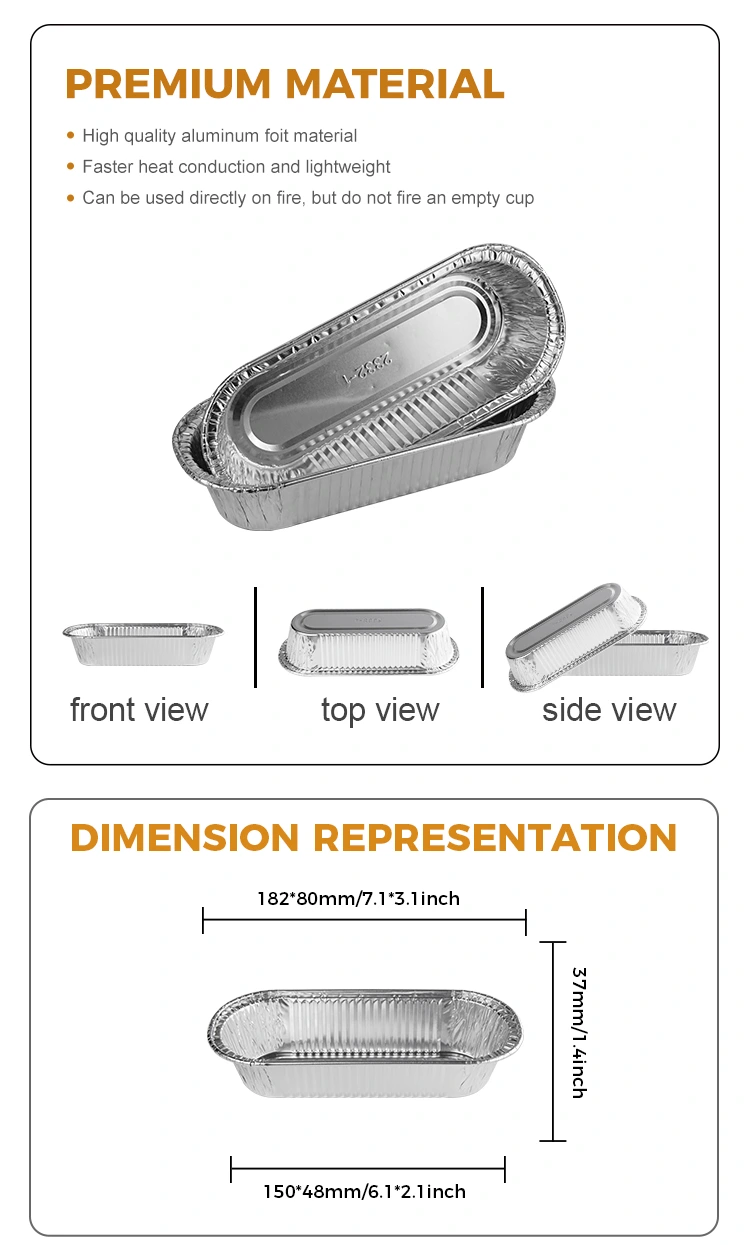 Yunchu -alumiinifoliotoimittajan soikea ilmakierrosleveä hopea -alumiinifolioastia on eräänlainen astia, jota voidaan käyttää höyryttämiseen, keittämiseen, leivontaan, leivontaan ja muihin tarkoituksiin ja jota voidaan käyttää kastikkeisiin, kastikkeisiin, pieniin mausteisiin ja leivontanäytteisiin. 8011-0 -tyyppinen alumiinifoliomateriaali, vetolujuuden vastus ja korroosionkestävyys on hyvä pidennys, paksunoitu alumiinifoliomateriaali, kestävä ja ei helppo murtaa tahdon mukaan, Hemming, etu- ja takaosa-ympyränsuunnittelu ei vahingoita käsiä, integroitu muovaus, seinäpinta on yhtä sileä kuin peili, rikas koko, joka sopii käytettäväksi monissa tilanteissa.