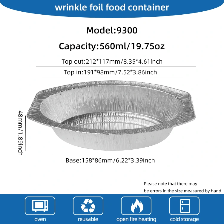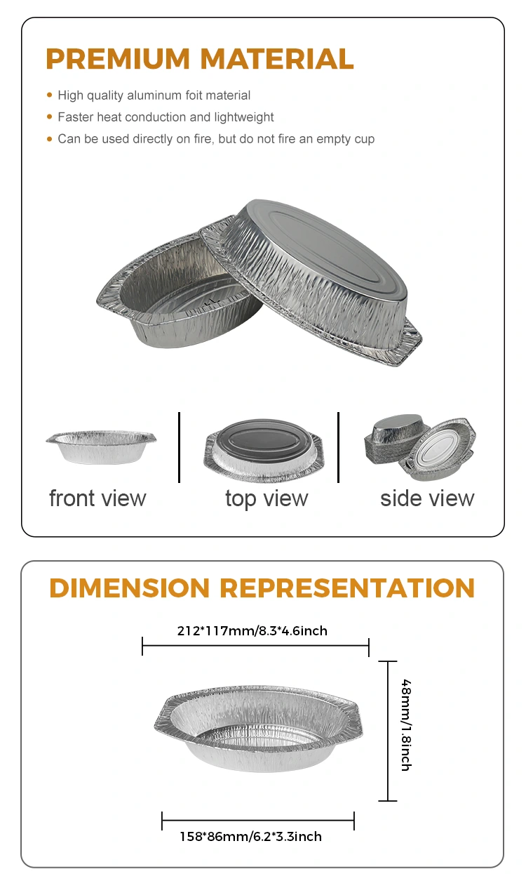 Yunchu -alumiinifoliotoimittaja tarjoaa soikea leipä hopea -alumiinifolioastiat kodin ruoanlaittoon, leipomoihin, ketjukaupoihin ja jäähdytetyn ruoan toimittamiseen. Ruoka-luokan alumiinifoliomateriaalista valmistetulla astialla on ainutlaatuinen soikea muoto, joka tekee siitä erottua monista hopeapaidolaatikoista. Tämä astia soveltuu erityisen hyvin kuumien nenäliinojen, hedelmien, leivän ja kaikenlaisten retort -ruokien pitämiseen, ja se voi vastata laajan valikoiman ruokia. Hyvän lämmönjohtavuutensa vuoksi se voi tasaisesti hajottaa korkeita lämpötiloja varmistaen, että ruokaa lämmitetään tasaisesti. Lisäksi sillä on tietty kuormituskyky ja paineenkestävyys, joka ylläpitää vakautta jopa useiden pinojen tapauksessa, muodonmuutoksen estäminen ja se on ihanteellinen käytettäväksi kuljetuksen aikana. Jotta voidaan sopeutua paremmin erilaisiin skenaarioihin ja tarpeisiin, tämä säiliö voidaan räätälöidä myös asiakkaiden vaatimusten mukaisesti ja tarjota vastaavia kansia lisäämään käytännöllisyyttä.
