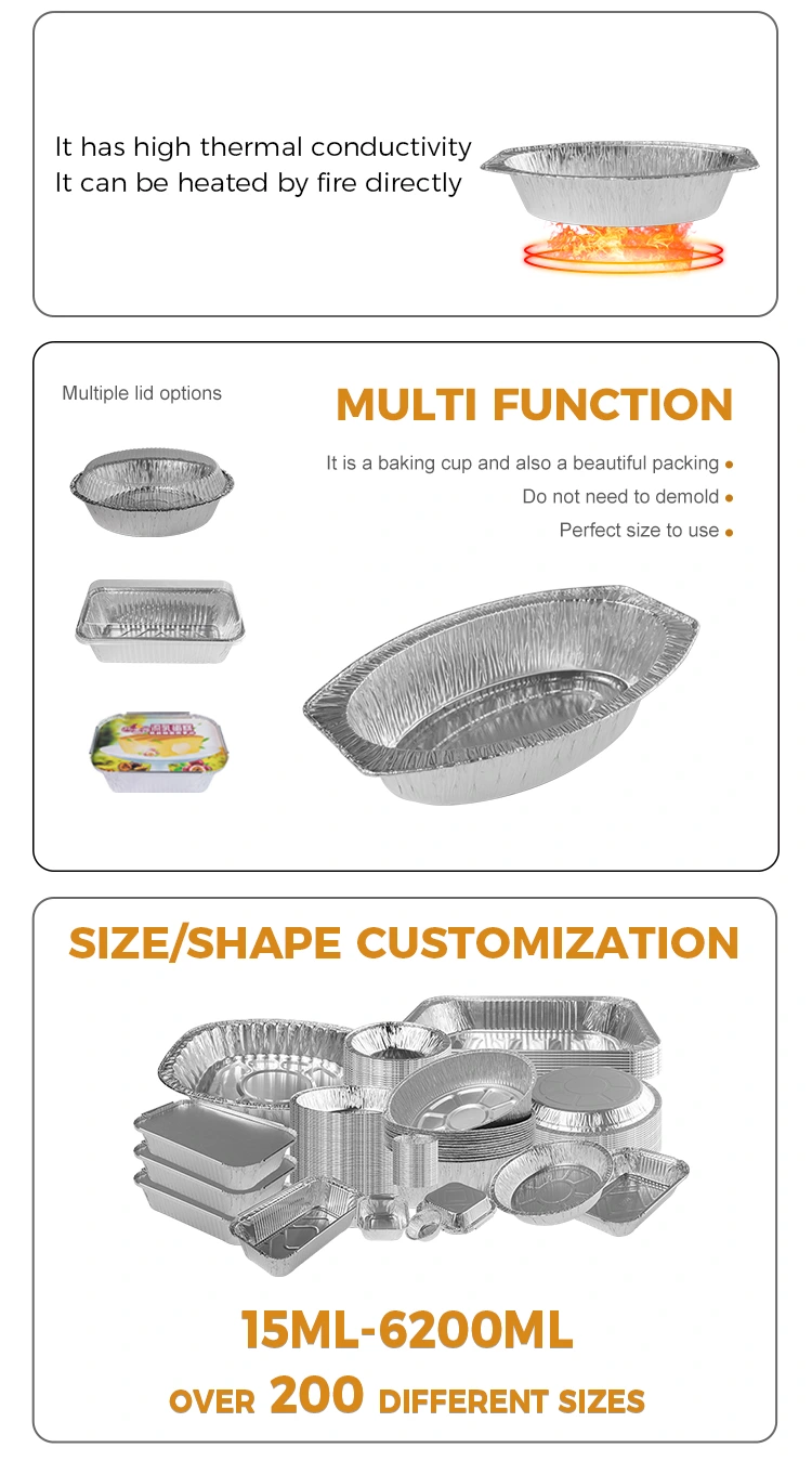 Tällä astialla on suuri kapasiteetti ja se sopii erilaisten päivittäisten ruokien ja välipalojen varastointiin. Kertakäyttöisenä esineenä ei tarvitse pestä, mikä säästää suuresti työvoimakustannuksia. Tuote on varustettu alumiinifolio-lemmikkieläinten peitteellä ja alumiinifoliossa lämmön sulkeutumiskalvolla öljyvuotojen, ei veden vuotamisen, korkean lämpötilan kestävyyden varmistamiseksi, ei helppoa muodonmuutosta, parantaa ruoan tuoreutta ja lämmön säilyttämistä ja tekee kuljetusvaikutuksesta paremman. Samanaikaisesti tuote on ISO9001- ja SGS -elintarvikkeiden kosketusstandardien mukainen, mikä tekee siitä turvallisen ja luotettavan.