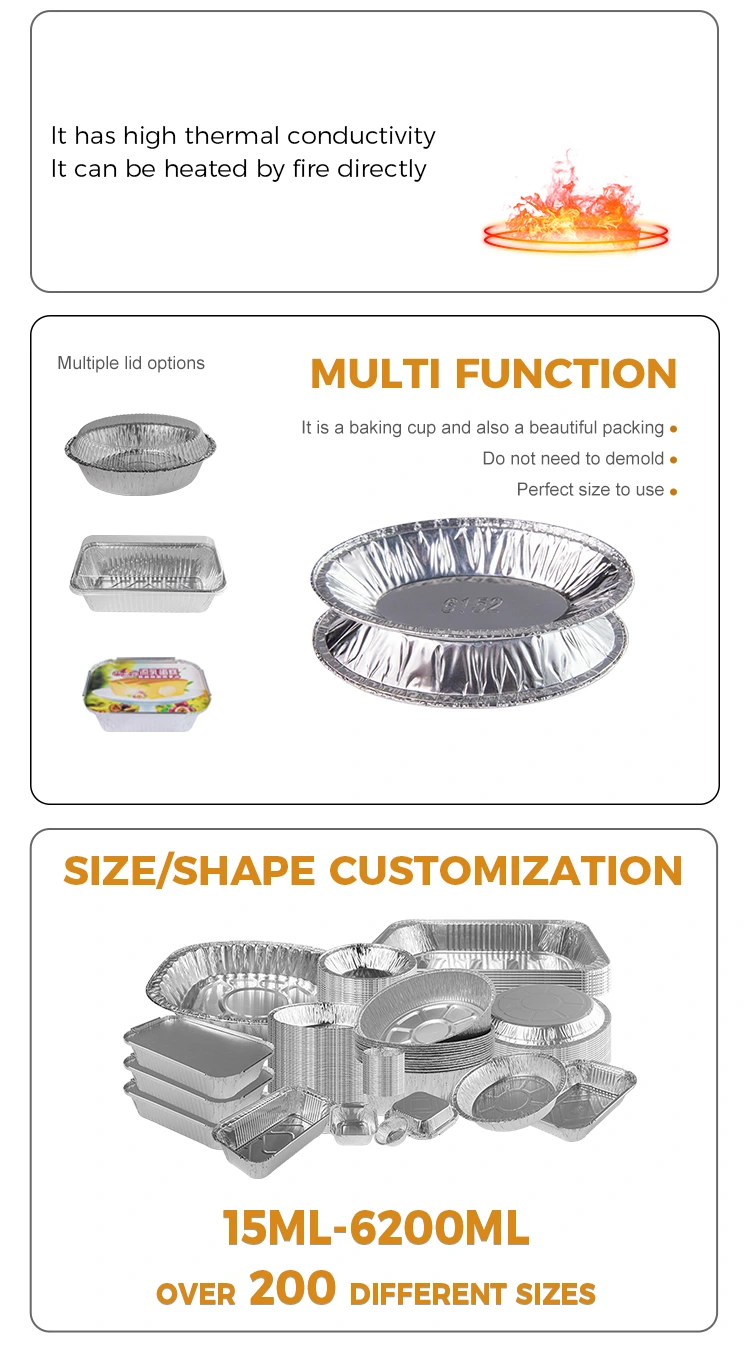 Ominaisuudet: Yksiosainen muovaus paksuuntunut ja leivottu resistentti, ottaen käyttöön elintarvikkeiden kosketusluokan alumiinifoliomateriaali, lepo varmistettu koskemaan ruokaa, ei helppoa muodonmuutosta eikä vuotamista, voimakasta paksuutta, korroosionkestävyyttä, korkean lämpötilankestävyyttä.