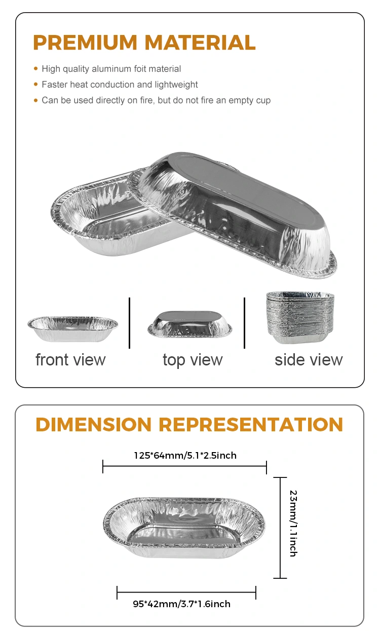 Yunchu -soikea leivontahopeafolioruokasäiliö on erittäin vaatimaton koko, ylimmän halkaisijan ollessa 125*64 mm (5,1*2,5 tuumaa), pohjahalkaisija 95*42 mm (3,7*1,6 tuumaa), vain 23 mm: n korkeus (1,1 tuumaa) ja 105 ml (3,7 oz) kapasiteetti. Tätä kokoa ei ole vain helppo kuljettaa, vaan se voi myös vastata moniin erilaisiin käyttötarpeisiin.