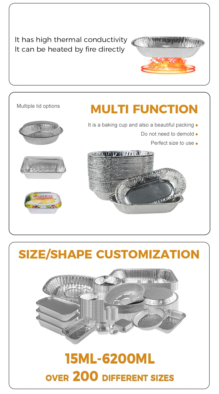 Soikea paahdettu hopea -alumiinifolioruokasäiliö 6005 soveltuu ateriapalveluihin, takeaway -toimitusalustaan, suureen juhlatilaan, buffetiin ja muihin tapauksiin, ja sitä voidaan käyttää pienten kakkujen, keksien, suklaan, kastikkeiden ja muiden ruokien pitämiseen. Tämä kompaktifoliolaatikko on hieno lisäys lautasellesi riippumatta siitä, onko se pariksi erilaisten kastikkeiden kanssa tai koristeeksi paistettujen jälkiruokien kanssa. Kevyt ja kestävä, säiliö on valmistettu korkealaatuisesta alumiinifoliosta, ja yläosassa on räätälöity läpinäkyvä PET-kansi ja kiinteä kansi, joka estää ruokaa tarttumasta leivinlevyyn, mikä on helppo vapauttaa ja puhdistaa sekä helppo kuljettaa ja käyttää.