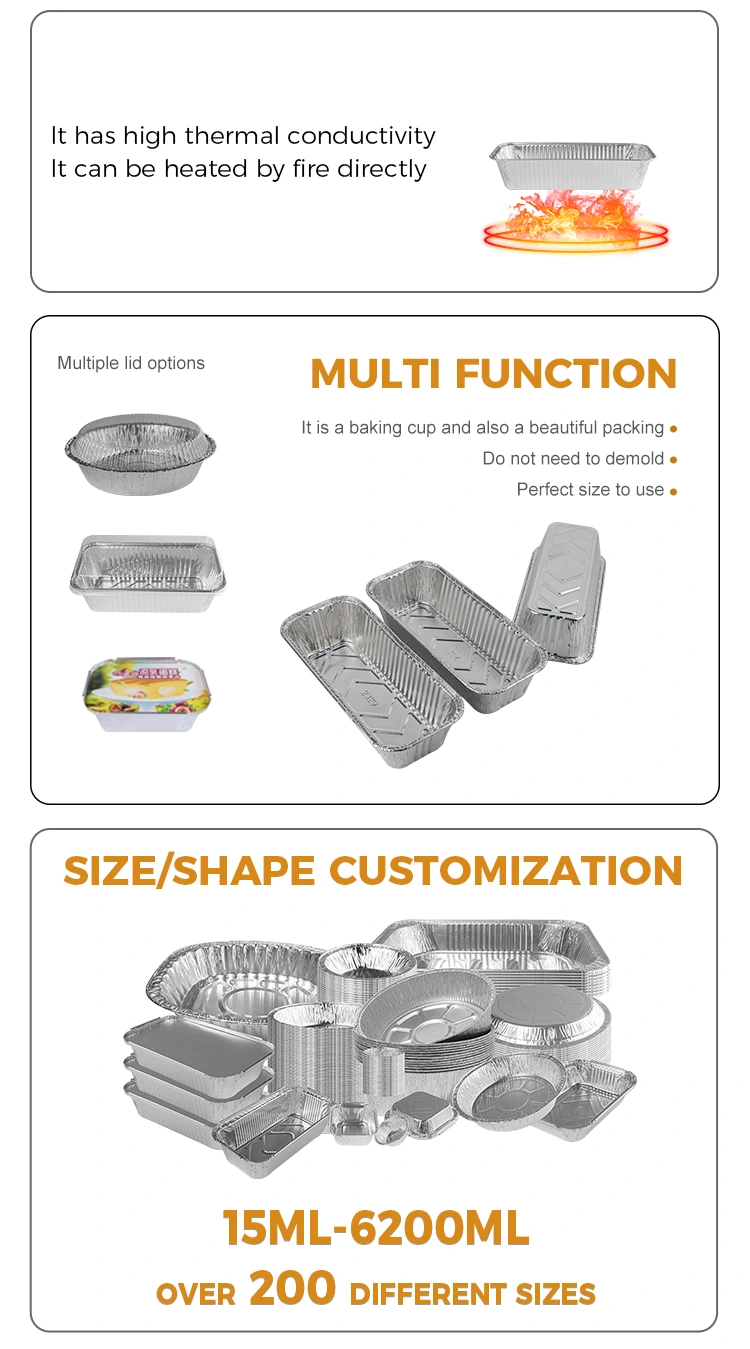 Tämä astia ei ole vain lämmönkestävä ja öljynkestävä, vaan myös erittäin helppo leipoa, joten se on erityisen sopiva käytettäväksi ilmakeittimissä ja muissa laitteissa. Laita siihen vain ruokaa tai keittoa, kun sitä käytetään huolehtimatta siitä, että se kuivuu. Kodinkäyttäjille se on vielä puhtaampi ja kätevämpi, ja ei ole pesua, joka tekee puhdistuksen helpoksi ja nopeaksi. Suorakulmainen BBQ: n paksuuntunut hopea -alumiinifolioastia on välttämätön auttaja keittiössäsi. Olipa kyse jokapäiväisestä ruoanlaitosta tai erityisistä tilaisuuksista, se tarjoaa täydellisen ratkaisun. Tule ostamaan ruoanlaitto -elämästäsi helpompaa ja herkullista!