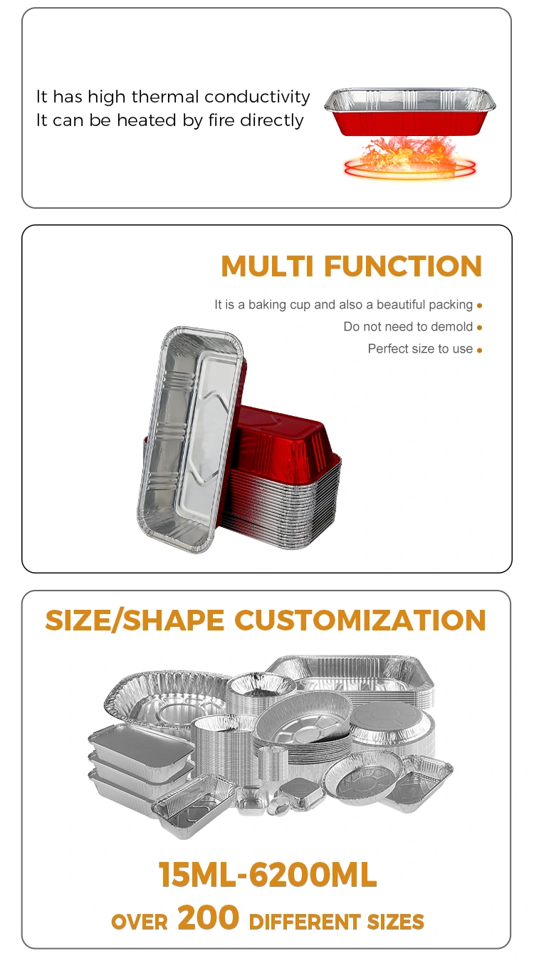 Yunchu-alumiinifolio tarjoaa sinulle korkealaatuisia suorakaiteen muotoisia punaisia ​​leipomoruokailutuotteita. Hopeaalumiinifoliosäiliöt on suunniteltu kestäviksi ja kuumuutta kestäviksi, jotka johtavat tasaisesti lämpöä hiiltymisen estämiseksi, ja niissä on vahva tiiviste pitääkseen tuoreena.