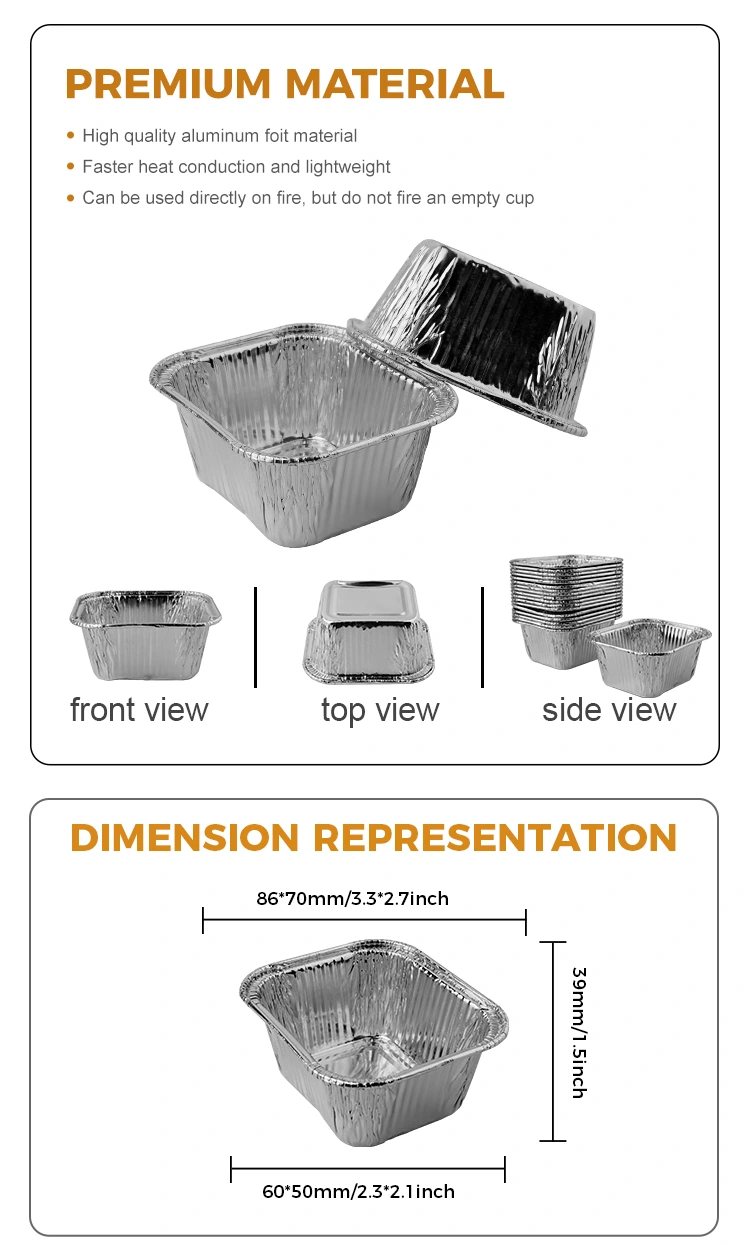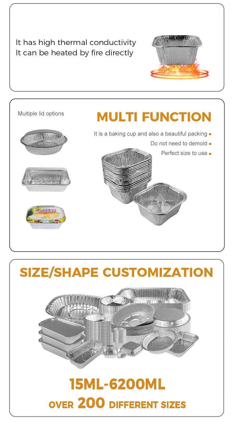 Yunchu -alumiinifoliotoimittajan toimittama neliömäinen leivontapannu -ilmakeittiöhopea -astia soveltuu moniin tapauksiin, mukaan lukien ilmankuoret, pienet leivontauunit, catering takeaway ja kahvila. Se ei sovellu vain osterin vermicellin, jälkiruokapunaisten papujen, grillattujen kanansiipien ja höyrytettyjen kakkujen valmistukseen, vaan se voidaan myös yhdistää monien ainesosien kanssa, ja sitä käytetään laajasti ruokailualan kaikilla osa -alueilla. Astiassa on tarttumaton ja tarttuva muotoilu, jossa on kovera ja kupera pohjarakenne, joka helpottaa ruoan vapauttamista muottia ja ylläpitää parempaa ulkonäköä. Grillataanko se tai höyrystyy avoimen liekin yli, voit käsitellä sitä helposti rajoittamatta. Sen materiaali on tukevaa ja kestävää, joten se sopii käytettäväksi paitsi uuneissa ja ilmakeittimissä, myös avoimissa liekkigrilleissä tai höyrylaivoissa, mikä on kätevää ja nopeaa. Lisäksi säiliön pinta on sileä ja litteä, ja reunat ovat pyöristettyjä eikä niitä ole helppo raaputtaa käsiä, ja vaikka taitoksia olisi, se ei vaikuta pitoan. Tarjoamme erilaisia ​​PAN-muotoja, mukaan lukien neliömäiset, pyöreät ja sydämenmuotoiset tyylit, vastaamaan monipuolisia tarpeitasi. Jos olet kiinnostunut, ota rohkeasti yhteyttä asiakaspalveluhenkilökuntaan saadaksesi lisätietoja.